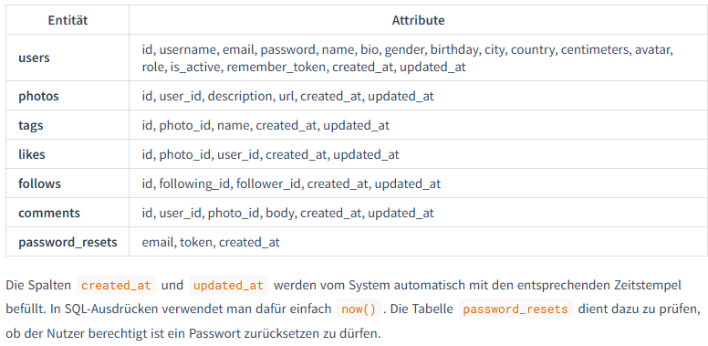 Neben der Relation (Tabelle) "users" hat Instahub weitere Tabellen, die für die Funktionen eines sozialen Netzwerks erforderlich sind. Diese sind aus dem ERM abgeleitet.