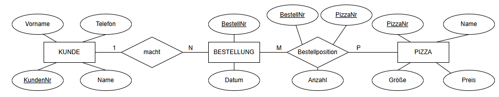 Aufgaben zur LK-Vorbereitung Lösungen Aufgabe 1 ERM: RM: (Achtung: Fremdschlüssel mit # davor) ◦ KUNDE (KundenNr, Name, Vorname, Telefon) ◦ BESTELLUNG (BestellNr, Datum, KundenNr) -> Fremdschlüssel zum Kunden. ◦ PIZZA (PizzaNr, Name, Größe, Preis) ◦ BESTELLPOSITION (BestellNr, PizzaNr, Anzahl) 0