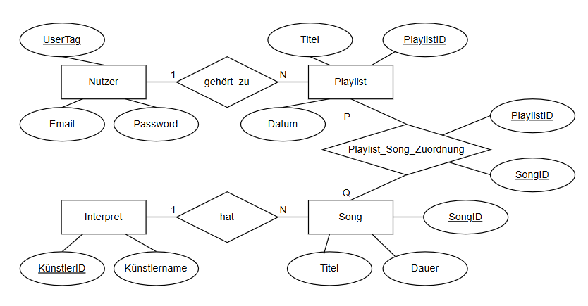 ◦ PLAYLIST (PlaylistID, Titel, Datum, UserTag) -> Fremdschlüssel zum Nutzer.