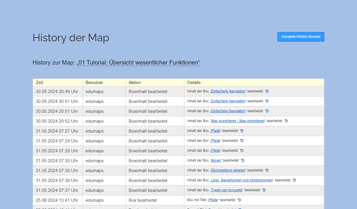Für jede Map wird festgehalten, welcher Benutzer welche Änderung vorgenommen hat. In der sogenannten „History der Map“ können Sie sich alle Änderungen betrachten und nachvollziehen, wer an Ihrer Map mitgewirkt hat.