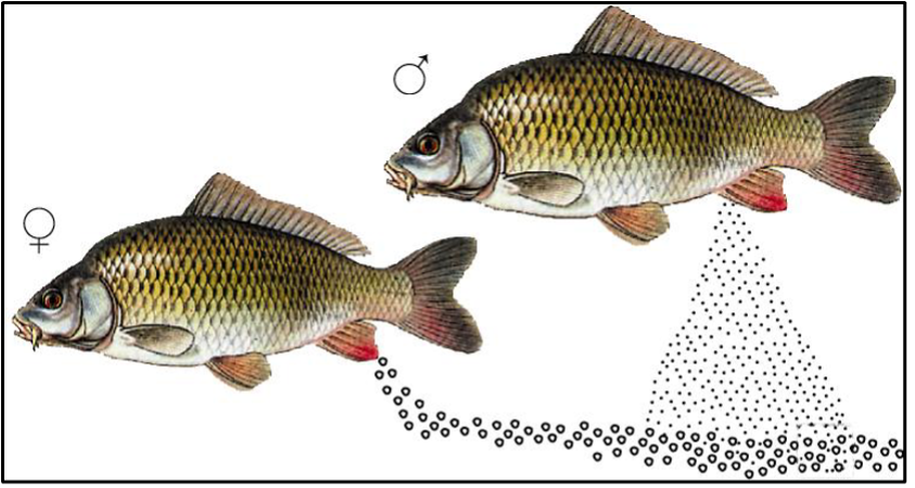 Die meisten Fische legen Eier (Laich) ins Wasser. Das Männchen gibt seine Spermien (Samen) darüber, damit die Eier befruchtet werden. Das nennt man äußere Befruchtung (äußere Besamung). Aus den Eiern schlüpfen nach einiger Zeit junge Fische (Larven). Manche Fischarten, wie Haie, haben eine innere Befruchtung (innere Besamung).