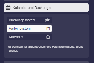 Um das Verleihsystem für eine Box zu aktivieren, öffnen Sie die Box-Einstellungen und klicken auf „Kalender und Buchungen“ und wählen dann „Verleihsystem“.