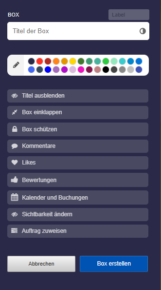 - Im Box-Editor geben Sie der Box einen Titel. Außerdem können Sie verschiedene Optionen festlegen.